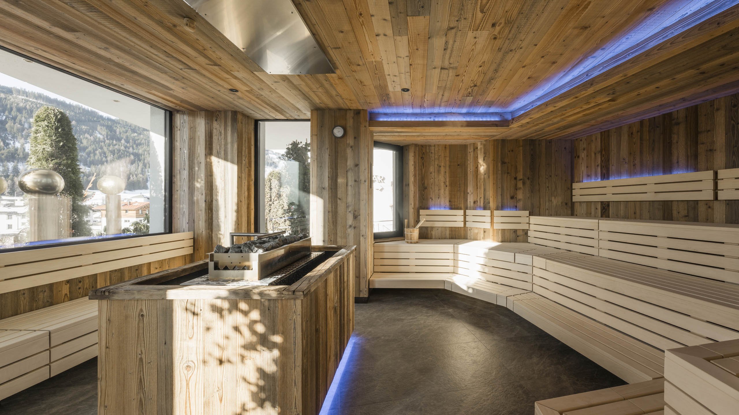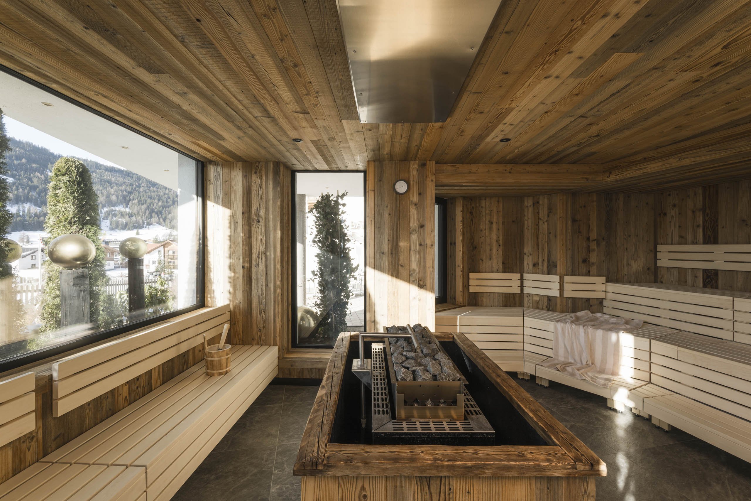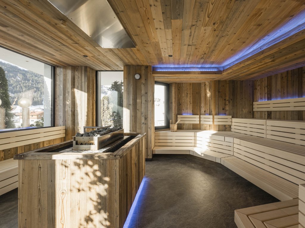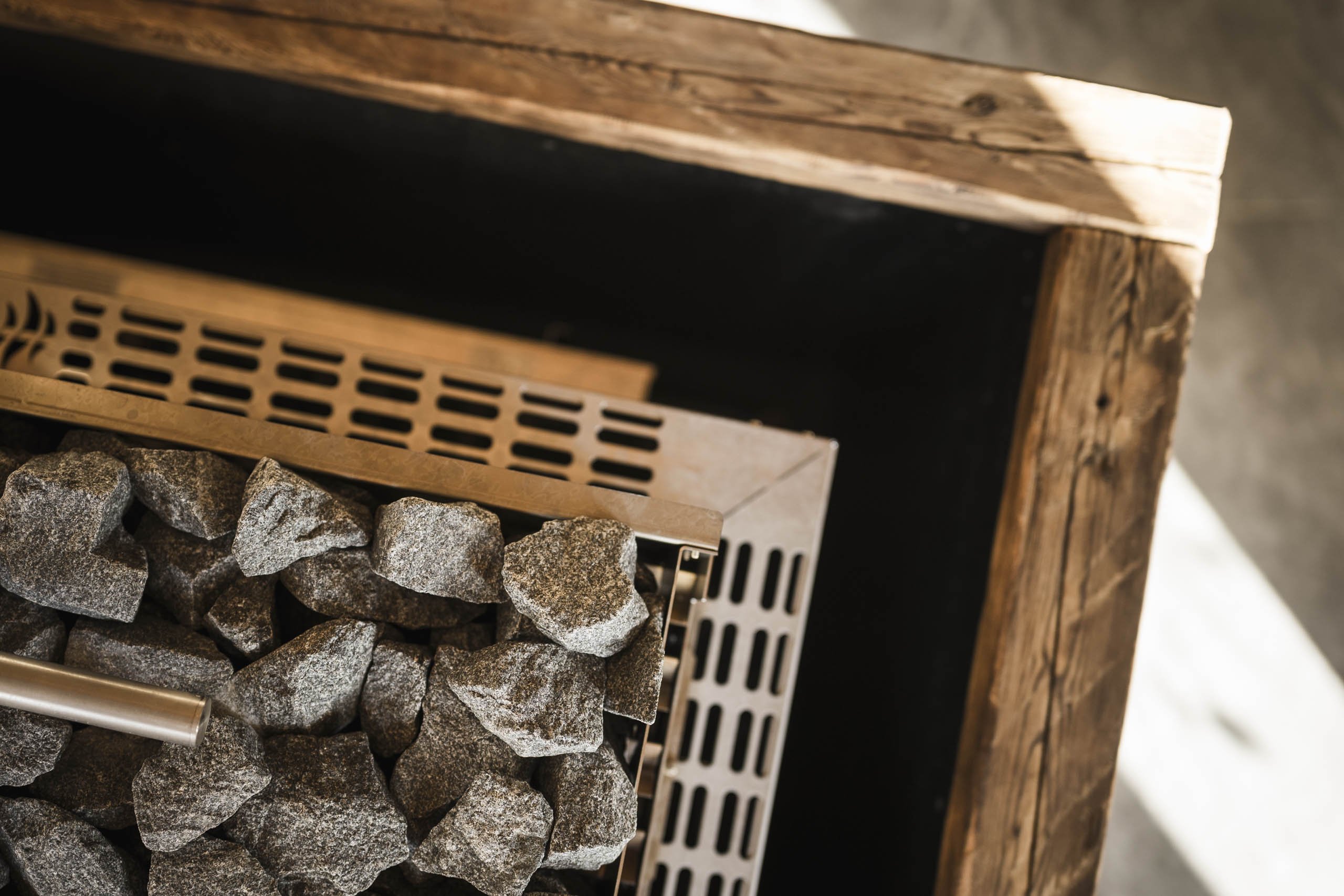 - Stone sauna (55-60°C) with automatic bucket infusions